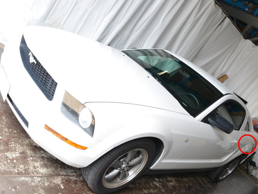 マスタングのドアミラー下のヘコミ修理 お車の気になるヘコミは見つけたらすぐにでも直したいところ。 近年特に注目されているデントリペアという塗らずにヘコミを裏から …