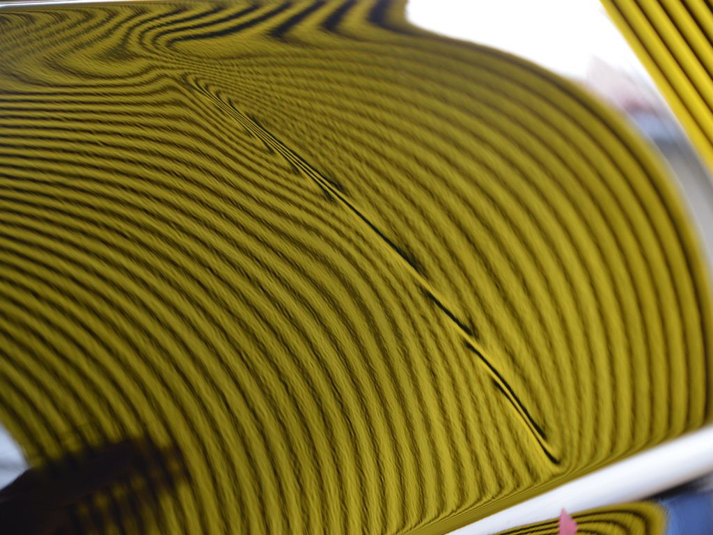ドアプレスラインの潰れもしっかり復元いたします 今回はプジョー407のドアプレスラインに10センチほどの深いへこみ修理例です。 へこみの位置は右のリアドアで、か …