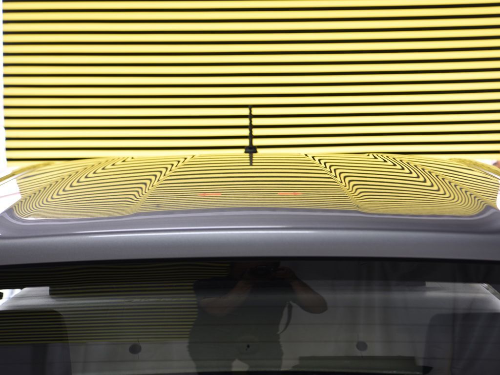 ヘコミはルーフのプレスラインを中心に4箇所横並びに凹んでいます。ラインボードでよく見るとピラーにも左右にヘコミがありました。一つ一つ中心に深く折れのあるヘコミですが、キズもほとんど無く塗らずに直せそうなのが不幸中の幸い。